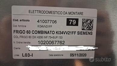 Vendo per ristrutturazione cucina frigo combinato da incasso Siemens (2020) con colonna, senza anta. Codice KI34VV21FF