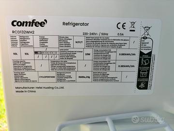 Frigorifero da tavolo Comfee' RCD132WH2, capacità 93L, peso 20Kg, misure (L x P x A) (mm) 472 x 450 x 850, potenza assorbita 0,5A, 175W. Presenta temperatura regolabile manualmente con rotella, piedini regolabili, tre ripiani, sportello superiore per mantenimento cibi congelati. Funzionamento perfetto, usato una sola volta in campeggio lo scorso anno, due piccole ammaccature nell’angolo posteriore sinistro (già arrivato così dal corriere).
