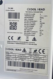 Vendo chiller Cool Head TK 390 usato in **ottime condizioni**, ideale per attività commerciali o uso domestico. Funziona perfettamente, è silenzioso ed efficiente. Caratteristiche principali:** - Modello: TK 390 - Classe climatica: 4 - Intervallo di temperatura: +1°C ~ +12°C - Refrigerante: R600a (70g) - Consumo energetico: 1,79 kWh/24h - Tensione: 220/240V | Frequenza: 50 Hz - Potenza totale: 225 W | Corrente nominale: 1,96 A - Capacità netta/lorda: 207L - Peso netto: 64 kg - Produzione: Settimana 24/06/2021 - Certificazioni: CE, conforme RAEE/WEEE Caratteristiche principali:** - Modello: TK 390 - Classe climatica: 4 - Intervallo di temperatura: +1°C ~ +12°C - Refrigerante: R600a (70g) - Consumo energetico: 1,79 kWh/24h - Tensione: 220/240V | Frequenza: 50 Hz - Potenza totale: 225 W | Corrente nominale: 1,96 A - Capacità netta/lorda: 207L - Peso netto: 64 kg - Produzione: Settimana 24/06/2021 - Certificazioni: CE, conforme RAEE/WEEE
