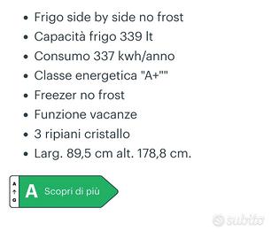 Vendo frigorifero a libera installazione Ariston Hotpoint side by side (americano a doppia anta) modello Sxbhae930, Sistema di raffreddamento: No Frost - capacità totale lorda:510lt (frigorifero:339 It- freezer: 1711t) Display LED Funzioni: Holiday, Super Cool, Super Freeze, Child Lock - Ripiani in cristallo. Acquistato nel2020 circa, ha qualche imperfezione esterna e una scheggiatura in un singolo contenitore plastica interno, per il resto assolutamente in ottimo stato. NO SPEDIZIONE, solo ritiro a mano a carico dell'acquirente (1 piano no ascensore) zona Canale Monterano.