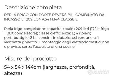 Perla frigo-congelatore; capacita' totale : 209 litri (172 lt frigo + 38lt congelatore); classe d'efficienza: E; 4 ripiani; portabottiglie; 2 balconcini; in dotazione:1 verduriera, 1 vaschetta ghiaccio. Il montaggio degli elettrodomestici non è previsto senza l'acquisto di una cucina.