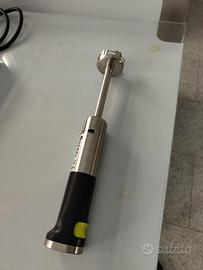 Realizzato in acciaio inossidabile satinato e ABS. Braccio di miscelazione rimovibile con lama a S. Funzione Smart Pressure: più il pulsante viene premuto, maggiore è la velocità della lama, mentre la regolazione continua della velocità garantisce un migliore controllo sul processo di miscelazione. 5 rapporti: da 11.000 giri/min (ingranaggio 1) a 16.000 giri/min (ingranaggio 5). Senza fili e ricaricabile – con batteria integrata: 2000 mAh, 150 W, 7,4 V. Indica 4 livelli di carica della batteria (100-75-50-25%). Tempo di funzionamento: fino a 30 minuti quando è completamente carico. Protezione: dopo 3 secondi senza attività la lama è bloccata.