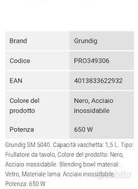 Frullatore Grundig SM5040 a bicchiere, in acciaio inossidabile, colore nero, in confezione originale