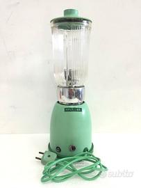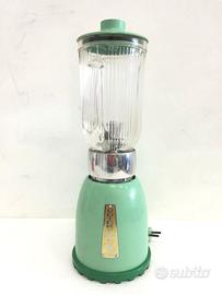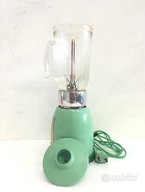 Frullatore Anni 60 "Quick Batter" prodotto dalla ditta OMBRE il frullatore funziona a 125 volt, struttura in Bakelite di colore Verde Acqua,contenitore in Vetro. CONDIZIONI PERFETTE Misura: Altezza cm 35