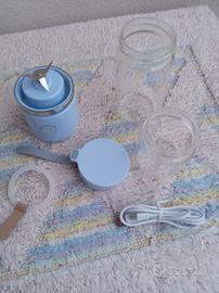 Frullatore ricaricabile portatile della BLENDER con n. 2 contenitori in vetro, uno piccolo da 200 ml e uno grande da 350 ml, compreso di cavo ricaricabile USB e guarnizione di ricambio. Specifiche batteria 1200 Max x 2, corrente nominale e tensione 17A/7,4 V. Potenza motore 126 W e velocità motore 16500 RMP +- 15%