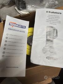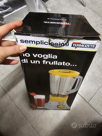 frullatore Termozeta bianco e giallo, linea "I Semplicissimi". Un tocco di colore per la tua cucina! Ideale per chi ama gli oggetti dal design pulito e allegro. Funziona perfettamente, ideale per preparare la merenda o il protein shake post-palestra. Include la sua scatola originale e il manuale. Condizioni eccellenti, come da foto, usato solo per provarlo