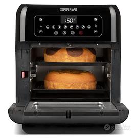Multifunzione: evoluzione della friggitrice ad aria, frigge, cuoce al forno, gratina, arrostisce, tosta, scongela e riscalda!Ampio vano con capacità 11 litri per cuocere grandi quantità di alimenti.Facile e semplice da pulire: vassoio antiaderente con funzione raccogligrasso che velocizza la pulizia della friggitrice.Grazie alla sua ampia finestra e luce interna potrai controllare la cottura degli alimenti in ogni momento.9 programmi preimpostati di cottura: Girarrosto, pizza, patatine, carni e spiedini, pesce e crostacei, verdure, pollo, dolci e riscaldamento.Temperatura regolabile da 80 a 200°C - timer 60 minuti2 Vassoi forati antiaderenti per cottura su più livelli | Display digitale | Accessori inclusi: cestello, accessorio per spiedini, girarrosto, rotanti e in acciaio INOX BPA/PFOA Safe.Dimensioni (L x H x P): 33 x 36 x 34