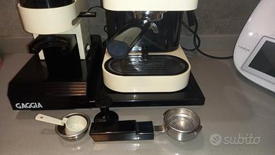 Gaggia baby 91 completa di base e macina caffè, 2 portafiltro, vari filtri di cui 1 pressurizzato per caffè già macinato, pressino e dosatore per caffè in polvere. La macchina viene venduta insieme ad un'altra macchina e un altro macina caffè per ricambi. Macchina perfettamente funzionante, decalcificata e con caldaia sostituita lo scorso anno. Guarnizioni sostituite insieme alla caldaia.