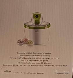 Gelatiera con ciotola di raffreddamento in alluminio. Capacità 1200 ml. Gelato pronto in circa 40 minuti. Imballaggio originale con libretto istruzioni.