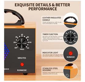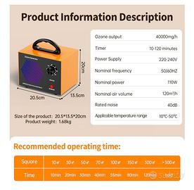 Ozonizzatore ad alta efficienza progettato per la sanificazione profonda dell'aria e l'eliminazione radicale di odori persistenti in grandi ambienti, veicoli e aree commerciali. Nuovo. Specifiche Tecniche e Prestazioni: Potenza di Emissione: 40.000 mg/h per un'azione d'urto su virus, batteri e odori. Area di Copertura: Efficace su superfici fino a 300 metri quadrati. Tecnologia Avanzata: Piastra in ceramica a quattro strati per prestazioni stabili e ventola ad alta velocità (40 dB) per una distribuzione uniforme dell'ozono. Timer Intelligente: Regolabile da 10 a 120 minuti con funzione "Hold" per funzionamento continuo. Design Professionale: Scocca interamente in metallo, impugnatura isolata e peso contenuto di soli 1,68 kg. Ambiti d'Uso: Rimozione Odori: Elimina fumo, odori di cucina, animali domestici, muffa e gas nocivi alla sorgente. Versatilità: Ideale per appartamenti, automobili, hotel, uffici e cucine industriali. ⚠️ Protocollo di Sicurezza (Obbligatorio): Ambiente Vuoto: Vietato l'accesso a persone e animali durante il funzionamento. Post-Trattamento: Attendere 30-60 minuti dopo lo spegnimento prima di rientrare. Ventilazione: Aprire porte e finestre per aerare i locali prima di soggiornarvi. ⏩Offro e pretendo massima serietà, il ritiro in zona è sempre possibile ad Alfonsine (Ra), altrimenti con la modalità di spedizione stabilità in piattaforma. Per favore astenersi perditempo o curiosi. Leggete sempre la descrizione in dettaglio del prodotto, e guardare le foto, il prodotto è nuovo e funzionante la restituzione non è accettata, grazie. ⏪
