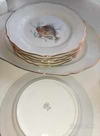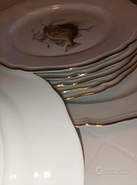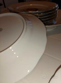 Bellissimo servizio Ginori vintage anni ’80, composto da 6 piatti e un vassoio coordinato con elegante bordo oro. Ideale per collezionisti o per dare un tocco retrò alla tavola.