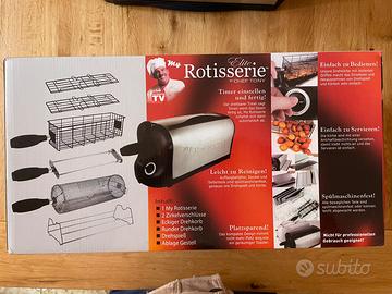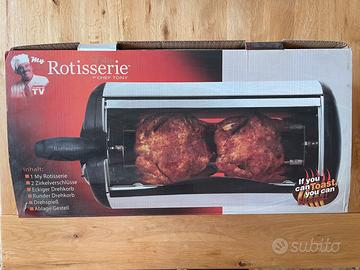 Piccolo forno girarrosto che permette di cuocere i cibi come una rosticceria, ottimo gusto, senza olio o altri grassi. Presentato e consigliato anche dallo Chef Tony. Facile da usare, occupa poco spazio e risulta utilizzabile sia per carni e pesce che verdure.