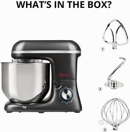 Accessori inclusi: uncino impastatore e mescolatore in alluminio, frusta sbattitrice in acciaio inox, coperchio in plastica trasparente