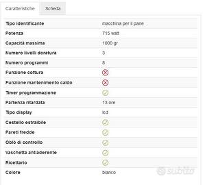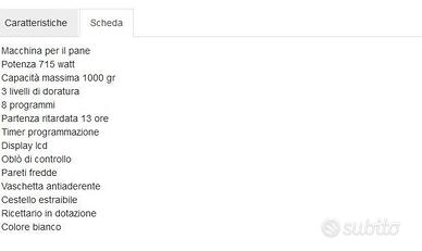 Vendo macchina del pane Girmi MP10, oggetto nuovo e mai usato, ancora nella sua confezione originale (aperta solo per controllo). È un modello molto affidabile e potente, ideale per chi cerca semplicità e risultati eccellenti. Specifiche Tecniche: Potenza: 715W (molto efficiente per impastare e cuocere perfettamente). Capacità massima: Fino a 1000g (1kg), ideale per famiglie. 8 Programmi preimpostati: Per diversi tipi di pane, impasti e cotture. Personalizzazione: 3 livelli di doratura della crosta (chiara, media, scura). Timer Programmabile: Partenza ritardata fino a 13 ore (per avere il pane caldo al risveglio). Display LCD: Comodo e intuitivo per monitorare le impostazioni. Sicurezza: Pareti fredde (non scotta all'esterno) e oblò di controllo per seguire la lievitazione. Pulizia: Cestello estraibile con rivestimento antiaderente. Stato: Mai accesa, condizioni 10/10. Accessori: Include cestello, pala impastatrice e ricettario originale. Visionabile e testabile di persona senza impegno. Vendita in formula "visto e piaciuto". Prodotto fuori garanzia. Disponibile per ritiro a mano o spedizione tracciata a pagamento. Occasione!