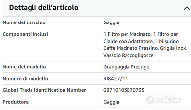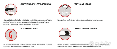 Macchina per il caffè manuale con portafiltro pressurizzato 2 filtri inclusi: 1 per caffè macinato, per 1 o 2 tazze e 1 per cialde di carta monoporzione, con apposito adattatore Pannarello classico in acciaio inossidabile per emulsionare il latte o erogare acqua per tè e tisane Piano appoggiatazze inox per mantenere le tazzine calde e pronte all'uso Design compatto ed ergonomico Prodotto destinato all'uso domestico In buone condizioni, va fatto il trattamento di decalcificazione per farla tornare come nuova.
