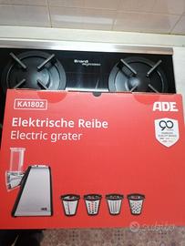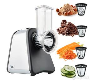 GRATTUGIA ELETTRICA da Cucina ADE KA1802. Motore Potente fino a 500 Watt. Semplice utilizzo tramite tasto. Include 4 Inserti a Tamburo Lavabili in Lavastoviglie con Lame in Acciaio Inossidabile. Ideale per Grattugiare e Affettare Verdure, Frutta, Noci e Formaggi a Pasta Dura. Cosente di Grattugiare Finemente, Grattugiare Grossolanamente e Affettare. Avvolgimento Cavo Integrato.