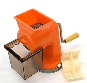Con la ventosa per il fissaggio al tavolo, il contenitore per il grattugiato, la maniglia per azionare la grattugia e il salva dita per premere il formaggio sulla grattugia durante la rotazione.