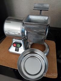 Grattuggia professionale costruita in lega di alluminio pressofuso e lucidato. Motore asincrono con termica di protezione e freno motore. Rullo in acciaio con trattamento electroless nikel plating e scodella formaggio in acciaio inox con grata inox di protezione allo scarico bocca grattugia.