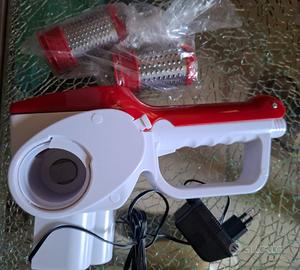 Grattugia senza fili con due rulli facilmente intercambiabili in acciaio per formaggi teneri e stagionati, cioccolato,frutta secca e pane secco. Batteria ricaricabile da posizionare sulla base di ricarica con autonomia fino a 40 minuti. Perfetta da portare in tavola. Impugnatura ergonomica per una facile presa. Premi alimenti per grattugiare i tuoi alimenti senza sforzo. Base di ricarica e adattatore in dotazione.