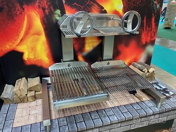 Griglia a carbone doppia da appoggio per ristorante o braceria, tenuta in esposizione come nuova. Regolazione dell’altezza delle griglie tramite volano frontale, ottima da inserire su postazione esistente.