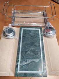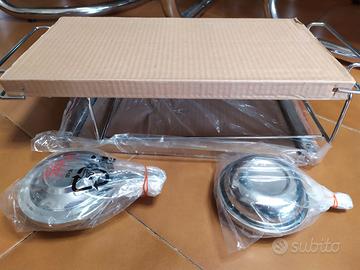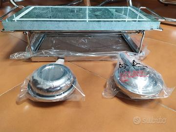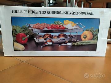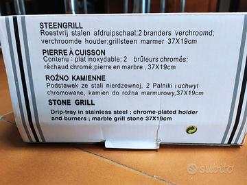 Griglia da tavolo in pietra ollare completo di 2 bruciatori a pasta combustibile, supporto e vassoio, ideale per una cottura perfetta sia di carne che di pesce. Il prodotto può essere posizionato a tavola durante una cena con gli amici così da decidere la cottura preferita degli alimenti. Nuovo come da foto