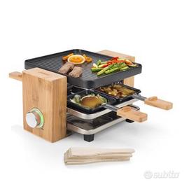 Vendesi mai usata griglia per raclette con piastra reversibile in alluminio pressofuso, 4 padelle per raclette e 4 spatole in legno