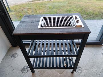 Grill elettrico ALPES INOX F530/GE in acciaio inox, installato su carrello di legno con ruote. Misure H92,5 L85 P46 cm Il grill è nuovo, utilizzato solo per esposizione, acceso per verificare il funzionamento. Il grill elettrico ed i particolari funzionali (griglia, cestino contenitore roccia lavica, il supporto interno e il vassoio sono costruiti in acciaio inox AISI 304 con satinatura argento). Le due resistenze gestibili separatamente, sono snodate per facilitare l’estrazione e la pulizia di tutti gli elementi. La roccia lavica ha la funzione di assorbire e distribuire il calore in modo uniforme. A differenza del carbone, non brucia, non si consuma e può essere lavata. Sotto la roccia c'è la vaschetta per l'acqua, dove durante la cottura il grasso cola passando attraverso la roccia, evitando così molto fumo. Il costo del solo grill elettrico è di €1.200.