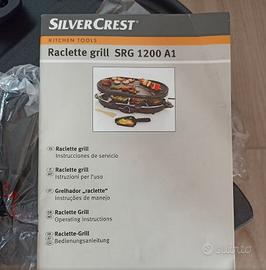Griglia per cucinare carne, pesce e verdure; piastra superiore removibile; termostato regolabile con indicatore luminoso; max 1200 W. Con 8 tegamini per Raclette, 6 spatole e libretto delle istruzioni.