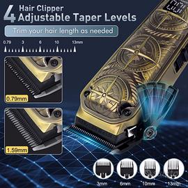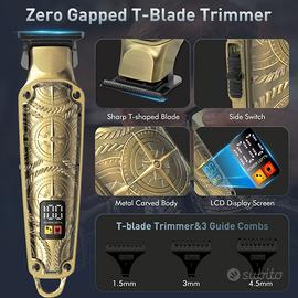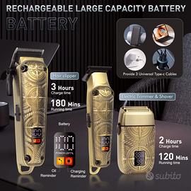 Hatteker Tagliacapelli Professionali per Uomo 3 in 1, Regolacapelli, Regolabarba, Rasoi Elettrici Senza Fili, Kit di Toeletta Uomo con Display LCD NUOVO MAI USATO LISTINO 50€ Set Tagliacapelli Professionale 3 in 1:Questo set include un tagliacapelli con lama regolabile dotato di 4 pettini guida (3mm/6mm/10mm/13mm) per diverse lunghezze di capello, un regolacapelli per barba e capelli con 3 pettini guida (1,5mm/3mm/4,5mm) e un rasoi a lamette. Con questo set sarai in grado di soddisfare la maggior parte delle esigenze di toeletta maschile! È un ottimo kit sia per uso domestico che per il barbiere. Motore ad alte prestazioni e lame in acciaio inox durevoli:Questo tagliacapelli e regolacapelli è dotato di un motore potente e lame in acciaio inox affilate per tagli veloci e sicuri, senza tirare o pizzicare i capelli. Mentre crei una varietà di acconciature, non brucerà la pelle a causa del calore generato durante l’uso, offrendoti un’esperienza di taglio confortevole e sicura. Lama a T ravvicinata e lama a doppia lametta:Il regolacapelli con lama di precisione crea contorni definiti e ritocca le basette. È un regolacapelli adatto a tutti i tipi di capello e a molte acconciature. Il rasoi elettrico a lamette con 2 lame cattura i peli corti e spessi e ritocca facilmente viso, collo e mascella senza tirare la barba, garantendoti un’esperienza di rasatura confortevole e pratica. Ricarica USB e lunga durata della batteria:Questo set di regolacapelli è alimentato da una batteria al litio ricaricabile tramite cavo USB. Inserisci il caricatore nella parte posteriore del tagliacapelli e collegalo alla corrente per iniziare la ricarica. È utilizzabile sia con filo che senza fili. Il tagliacapelli ha un tempo di ricarica di circa 3 ore e può essere utilizzato per circa 3 ore a piena carica. Il regolacapelli e il rasoi possono essere usati fino a 120 minuti dopo 2 ore di ricarica. Ideale per l’uomo:Con un design esterno distintivo aggiornato, un corpo in metallo molto tattile e u