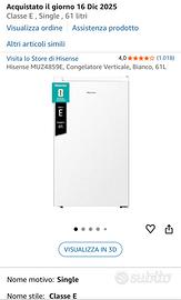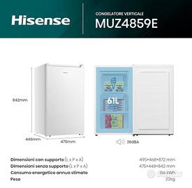 Hisense Modello: MUZ4859E Congelatore Verticale Colore: Bianco Capacità: 61L Classe efficienza: E Misure: - con supporto (L× P× A) 495×468×872 mm - senza supporto (L X P ×A) 475×448×842 mm - Peso 22kg Porta reversibile come è possibile vedere da foto Data di acquisto: 16 Dic 2025 (Ancora in garazia Amazon) Condizioni: presenta solo qualche difetto estetico che non pregiudica le prestazioni! I difetti estetici sono dovuti alla spedizione e sono quelli in foto, per il resto il congelatore è di ottima qualitá, silenzioso ed efficiente.