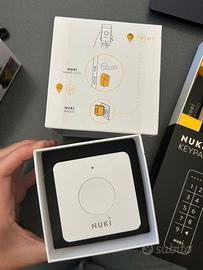 Set Nuki completi composti da bridge (per il controllo remoto via Internet), serratura intelligente Nuki, tastierino apriporta e UN SOLO opener da remoto.