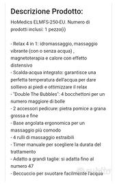Acceso solo x provare il funzionamento, mai usato. Adatto a piedi fino al n.47. Per il massaggio ci sono 4 rulli rotanti, 4 bocchette x produrre bolle, 2 accessori in pietra pomice a grana diversa x pedicure e lo scalda acqua x mantenere la temperatura. Venduto sui siti di e-commerce a più di 60€ svendo a 30€.