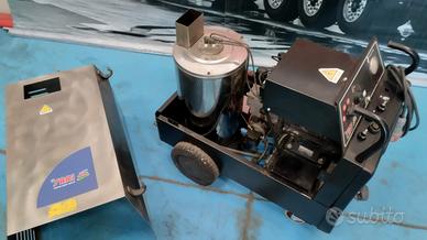 VENDO IDROPULITRICE PROFESSIONALI acqua calda con caldaia a gasolio di facile manutenzione alimentazione trifase a 380V pressione 200bar con portata 15.0 l/min (max 18.0) spia accensione spia riserva gasolio barometro in bagno di glicerina comando acqua fredda/vapore/off valvola regola temperatura cofano in acciao inox completa di tubo e lancia pronta all’uso Garanzia 12 mesi