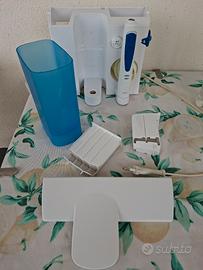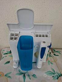 Idropulsore Oral-B Oxyjet completo di caricabatteria. L'apparecchio è di colore bianco con un serbatoio blu trasparente. - Serbatoio dell'acqua capiente. - Ugello Oxyjet incluso. - Base di ricarica.