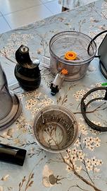 Estrattore Imetec Succovivo Slow Juicer SJ 1000 Professionale Estrazione a Freddo e Concentrato 7846M 240 Watt. 3 accessori per succhi, sorbetti, salse, vellutate fredde e latte vegetale. Funzioni: – Estrattore a freddo professionale, bassa velocità (60 giri/min), mantiene il 95% di vitamine di frutta e verdura – Tecnologia IMETEC PRO ad alte prestazioni ottimizza l’estrazione del succo e nutrienti con uno scarto minimo. – Coclea resistente con punte a diamante in ULTEM. – Potente motore a induzione da 240 W con ingranaggi in acciaio. – Imbocco largo. – Funzione Reverse per estrarre tutto il succo dalla frutta e verdura. – 2 filtri per regolare la quantità di fibra. – Accessorio sorbetti. – Miscelatore per mescolare l’estratto durante la spremitura. – Beccuccio a chiusura ermetica inclinato per agevolare la fuoriuscita del succo fino all’ultima goccia. Accessori: – Filtro a maglia stretta 0,4 mm per un succo puro e vellutato. – Filtro a maglia larga 0,8 mm per un succo denso, corposo e ricco di fibre. – Accessorio per sorbetti e salse. – 2 contenitori da 800 ml BPA Free, per il succo e per lo scarto. – Contenitore in Tritan™ antigraffio ultra esistente, BPA Free. Caratteristiche tecniche: – Dimensioni 23x21x49 cm. – Diametro dell’imbocco 45 mm. – Velocità: 60 giri/min. – Materiali a contatto con gli alimenti BPA safe. – Tensione 220-240 V. – Frequenza 50 Hz. – Potenza 240 W. – Alimentazione Rete. – Lunghezza cavo 1,2 m. – Colore argento/nero. – Peso 6,8 kg.