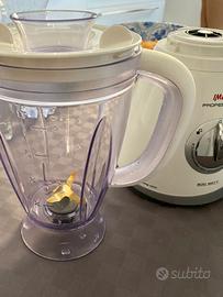 Robot da cucina 600 watt di potenza, funzionamento a 2 velocità + pulse, boccia da 800ml e frullatore da 1000 ml, lame in acciaio inox rivestite in titanio, pasta-maker con lama elicoidale, misurino forato per maionese, accessori lavabili in lavastoviglie.