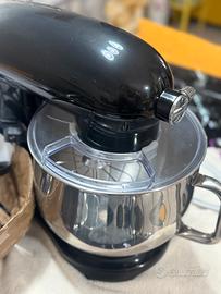 Utilizzata solo per impasti importanti, stessa tecnologia a motore diretto montato in testa come la Kitchenaid, quindi tanta potenza e resistenza. Nel perno frontale (fotografato apposta), monta gli accessori originali e non, della Kitchenaid, come quelli in foto, che lascio in omaggio. Completo di tutte le fruste classiche in foto, coperchio in plastica segnato ma perfettamente funzionale. Capacità ciotola 7 litri, diametro 24,5 cm; altezza 21 cm. Libretto istruzioni in dotazione. Pagata 150 € + 50 € il tagliaverdure. Cedo a 50€ per inutilizzo. Solo consegna a mano