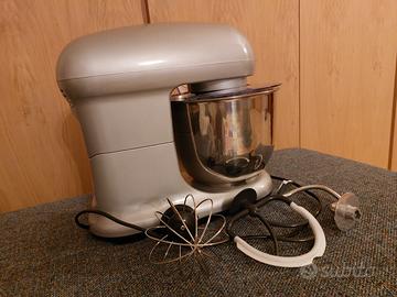 Impastatrice planetaria colore silver da 5 litri, 1300 watt, compresa di frusta a foglia, a filo e gancio.