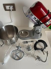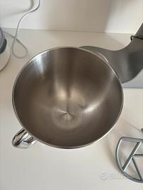 Impastatrice in ottime condizioni è perfettamente funzionante, provvista di accessori e manuale come da foto. Vano per inserti aggiuntivi mai utilizzato. Segni di usura minimi come da foto (segno di opacizzazione sulla ciotola, segni sul fianco del motore centrale dovuti ad adesivi per organizzazione del filo di corrente). Preferibile consegna a mano.