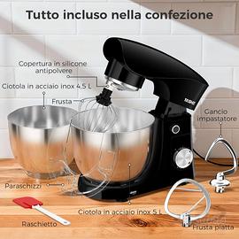 Accessori Versatili e Extra Inclusi: Questo robot da cucina include una frusta, un gancio impastatore e una frusta piatta, oltre a una spatola in silicone aggiuntiva per una raschiatura senza sforzo.