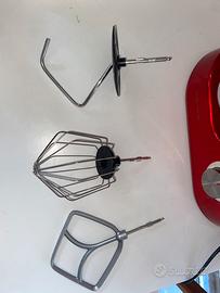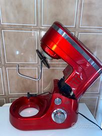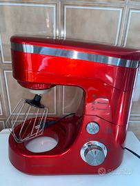 L'immagine mostra un'impastatrice planetaria rossa. L'utente sta cercando informazioni e istruzioni in italiano relative a questo elettrodomestico. Informazioni e istruzioni per un'impastatrice planetaria: Funzionalità: Un'impastatrice planetaria è progettata per diverse attività in cucina, tra cui mescolare, impastare, montare e incorporare ingredienti. La sua versatilità consente di preparare diverse ricette, dalle basi per dolci come la pasta frolla e il brioche all'impasto per pane e pizza, fino alla panna montata o alle uova. Movimento planetario: Il termine "planetario" si riferisce al movimento unico dell'accessorio (frusta, gancio impastatore o foglia). Ruota non solo sul proprio asse, ma anche attorno al perimetro della ciotola, garantendo una miscelazione completa e uniforme degli ingredienti. Accessori: Gli accessori più comuni includono la frusta a filo per montare e aerare, la foglia per mescolare gli impasti e incorporare gli ingredienti e il gancio impastatore per impastare impasti più densi come pane e pizza. Consigli d'uso: Ordine degli ingredienti: in genere, si inizia aggiungendo gli ingredienti secchi, come la farina, nella ciotola, quindi si incorpora il lievito e gli altri componenti necessari per le ricette specifiche. Velocità e tempo: regolare la velocità in base al tipo di impasto e alla consistenza desiderata. Ad esempio, impastare il pane richiede in genere una velocità inferiore e un tempo specifico per ottenere risultati ottimali. Potenza (Wattaggio): La potenza di un'impastatrice, misurata in watt, indica la sua capacità di gestire diversi tipi di impasti e miscele. I modelli con wattaggio più elevato sono generalmente più adatti per un uso frequente e per impasti più duri. Nuovo senza cartellino