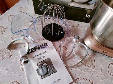 Con gancio impastatore, frusta, agitatore e coperchio paraschizzi. 6 velocità, funzione pulse e blocco di sicurezza.
