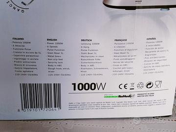 Materiale lama: acciaio. Materiale contenitore da 5 litri: acciaio inossidabile. Potenza 1000W, tensione di ingresso 230-240 V.