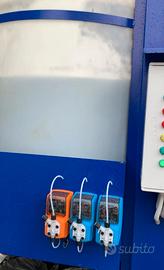 Impianto di depurazione di acque reflue compreso di due cisterne da 2.000 lt, raccoglitore per sistema di filtraggio a sacchi, quadro elettrico di comando e controllo, sistema di allarme fine reagenti, bacino di chiariflocculazione in PE antiacido, scarico automatico dei fanghi di depurazione, filtrazione fanghi a tasca, pompa alimentazione di tipo sommerso con regolatore di livello, pompe dosatrici elettriche per dosaggio reagenti chimici, tubo antiacido d.32 in PVC, raccordi antiacido in PVC, tubo a pressione in polietilene, pompa rilancio filtro a sabbia realizzato con colonna in acciaio completo di valvole per controlavaggio.