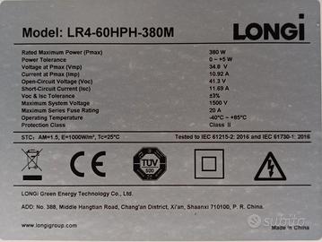 Vendo impianto fotovoltaico plug and play 350W acquistato un anno fa. Produzione effettiva di 400kw in un anno. Composto da nr. 1 pannello Longi Solar 380W ed inverter TSUN da 400W, telaio in alluminio ancoraggio tetto compreso. Telefonare SOLO ore serali.