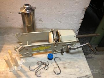 Insaccatrice professionale manuale per salumi dotata di doppia velocità di avanzamento, solida struttura metallica, tipiche di macchine di qualche anno fa, e cilindro in acciaio inox. In dotazione imbuti in plastica alimentare di varie misure. In omaggio piccoli accessori per la lavorazione di salumi. Altre attrezzature per lavorazione carni e salumi in altri annunci. Insaccatrice professionale manuale per salumi dotata di doppia velocità di avanzamento, solida struttura metallica, tipiche di macchine di qualche anno fa, e cilindro in acciaio inox. In dotazione imbuti in plastica alimentare di varie misure. In omaggio piccoli accessori per la lavorazione di salumi. Altre attrezzature per lavorazione carni e salumi in altri annunci. Viste le dimensioni ed il peso è preferita la consegna a mano in Basilicata e regioni confinanti, ma disponibile alla spedizione con corriere a prezzo da concordare.