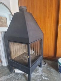 Struttura robusta in metallo con vetri laterali, ideale per riscaldare l’ambiente e creare un’atmosfera accogliente.