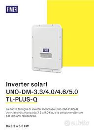Inverter Fotovoltaico Fimer UNO DM 4.0KW TL PLUS SB Q 2MPPT con sezionatore, gestisce una o due stringhe di pannelli. Oggetto perfetto, aquistato nel maggio 2023 con garanzia residua fino a maggio 2028.