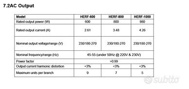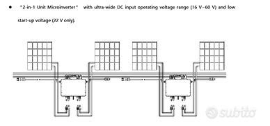 Microinverter 800 W HERF-800 Estar Energy impianto fotovoltaico balcone Microinverter 800 W HERF-800 Estar Energy USATO, da 11 mesi, perfette condizioni, con fattura, e garanzia di acquisto e tutti i certificati necessari. Microinverter a Unit Singola HERF-800 Estar Energy per Impianti Fotovoltaici Dispositivi elettronici da installare su ogni singolo pannello solare per convertire l'elettricit in corrente continua (CC) ottimizzando la produzione di ogni singolo pannello. Con un voltaggio minimo 22V e un intervallo di voltaggio ingresso in CC molto ampio (16-60V) permettono di configurare gli impianti con massima flessibilità ed efficienza in termini di potenza dell'impianto, numero di stringhe, lunghezza delle stringhe (da 1 a 11 moduli), sia negli impianti monofase che in quelli trifase. Caratteristiche: Facili da installare Flessibili nella configurazione Altamente affidabili Efficaci nel monitoraggio dell'impianto Con efficienza nominale MPPT 99,5 % Voltaggio minimo 22V Intervallo di voltaggio ingresso in CC 16-60V Certificato CEI 0-21 Garantito 10 anni