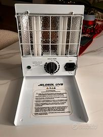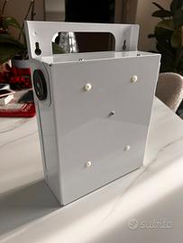 E' dotata di coperchio richiudibile che funge da base dell'apparecchio consentendo di regolare l'inclinazione del corpo lampada durante l'utilizzo.